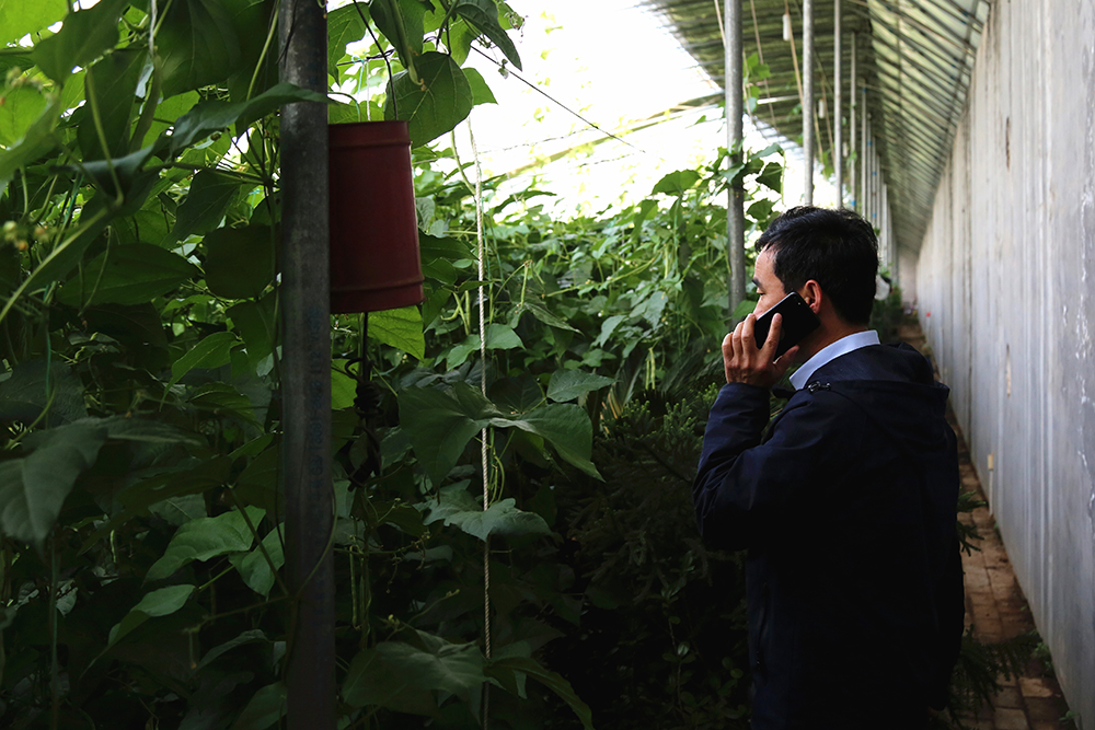 7:30當我們到達陳德國所在的大棚區(qū)時,他已經(jīng)工作了一個小時。“像這種老葉、黃葉要抓緊摘掉了,到了一定年限就只吃飯不干活,影響光合作用。”在蕓豆種植棚,陳德國正在電話指導著種植戶。