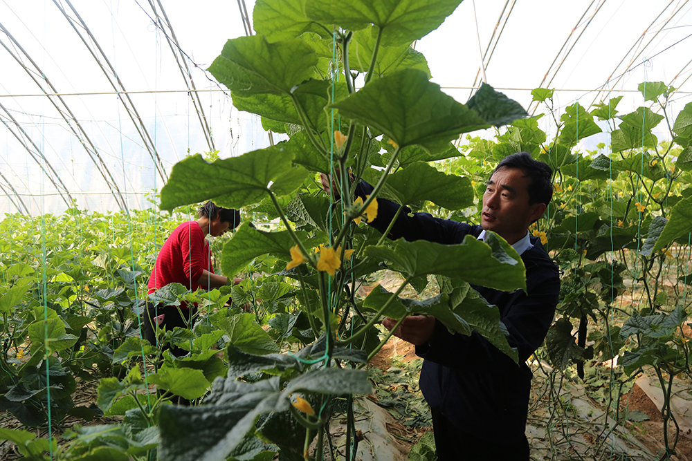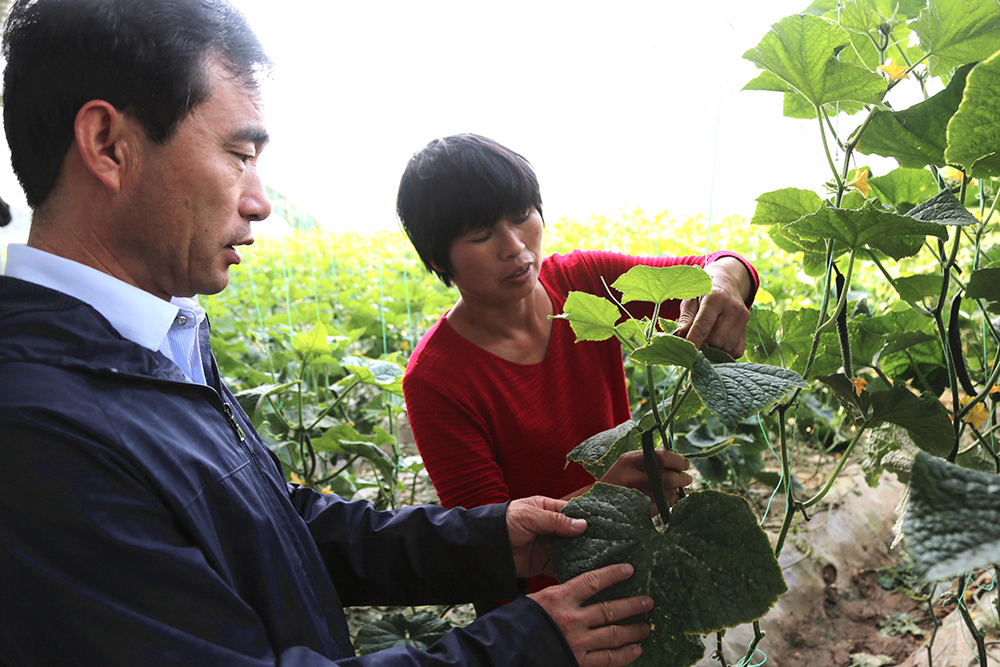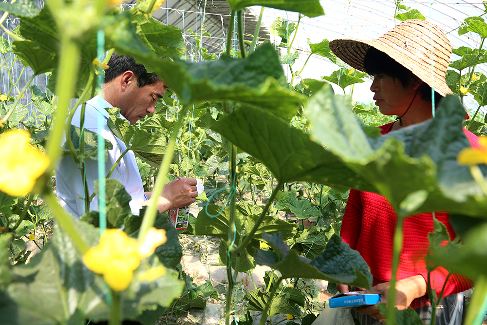 “打藥一定要按時打按量打,提前打了沒效果,拖后了就容易產(chǎn)生殘留,”陳德國仔細指導著黃瓜種植戶。