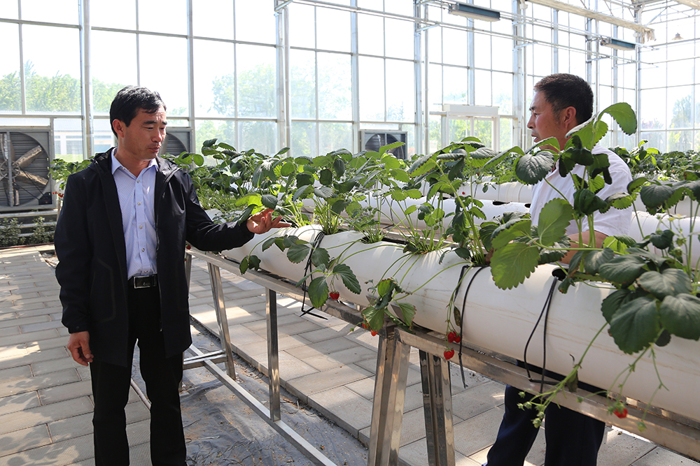 在連棟溫室里,陳德國察看前期做育苗試驗的情況。“草莓在這里第一年的種植效果就很好,原因在于前期我們吸取教訓,在這些塑料管子下面打孔處理,管內(nèi)放著陶粒和紗窗,給原有設(shè)備增加了透氣性。”陳德國解釋道。