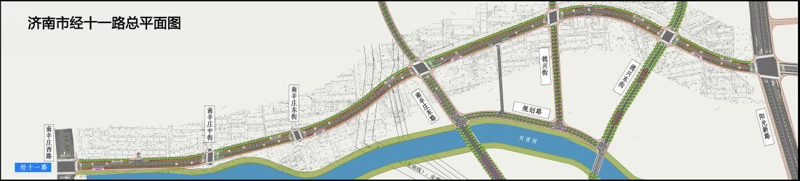 經(jīng)十一路(南辛莊西路-陽光新路)建設(shè)工程位于濟(jì)南市槐蔭區(qū),東起陽光新路,西至南辛莊西路,道路規(guī)劃紅線寬度為30米,快車道雙向四車道,全長約1967.99米,投資概算1.39億元。主要建設(shè)內(nèi)容包括新建道路、敷設(shè)雨污水管線,配套實(shí)施給水、燃?xì)?、熱力、弱電、電力等土建工程,同步進(jìn)行道路綠化、路燈、交通設(shè)施等建設(shè)。