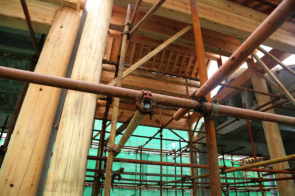 為消防安全考慮,項目建筑的屋頂及大部分構(gòu)件都摒棄了木質(zhì)結(jié)構(gòu),統(tǒng)一采用鋼筋混凝土結(jié)構(gòu)。雖然采用了現(xiàn)代材料,但是施工復雜程度卻比原始工藝大的多。“屋頂?shù)臉?gòu)件要用專門定制的模板逐層澆筑,較長的房梁還要逐段拼接,同時又要保證細節(jié)到位,做起來就比較耗時”,現(xiàn)場負責人介紹道。在項目入口處,有一棟小型建筑為全木制結(jié)構(gòu),據(jù)介紹,這棟建筑僅用三天就建造完成,而如果采用鋼筋混凝土結(jié)構(gòu),至少需要20天工期。