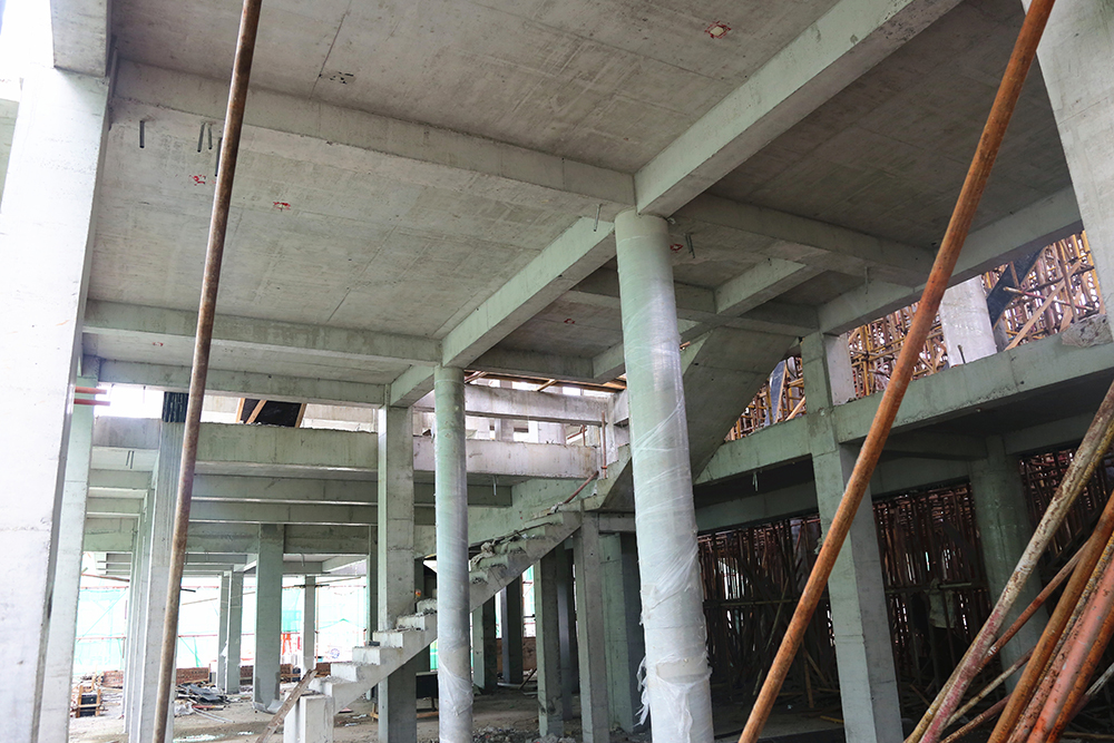 城門樓的工程量最大,項目內(nèi)施工難度最大的是緊靠城門樓的一棟2.5層(局部三層)的中西結(jié)合建筑,該建筑內(nèi)部為錯層結(jié)構(gòu),樓板需要逐層澆筑,同時還有單層挑高8米的高支模(高支模是指支模高度大于或等于5m時的支模作業(yè))作業(yè),施工方案經(jīng)專家反復論證后施行,為保證工期,這棟2.5層的“小建筑”最多80位工人同時施工。同樣,為了整個項目的推進速度,項目高峰作業(yè)期400多位工人同時施工,保證項目按質(zhì)按量推進。