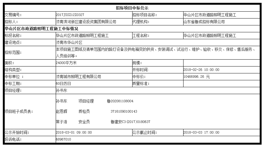 華山片區(qū)市政道路照明工程施工中標公示