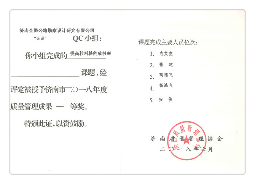 近日,濟(jì)南質(zhì)量管理協(xié)會(huì)組織召開了2018年度全市群眾性質(zhì)量管理活動(dòng)經(jīng)驗(yàn)交流會(huì),表彰群眾性質(zhì)量管理活動(dòng)中涌現(xiàn)出的優(yōu)秀QC小組、質(zhì)量信得過班組、先進(jìn)工作者及優(yōu)秀QC成果。金衢公司成立“金設(shè)”QC小組參與評(píng)選,申報(bào)的多個(gè)課題受到表彰:其中“提高粒料樁的成樁率”課題榮獲“濟(jì)南市2018年度質(zhì)量管理成果”一等獎(jiǎng);“提高路面結(jié)構(gòu)內(nèi)部排水效率”課題榮獲“濟(jì)南市2018年度質(zhì)量管理成果”二等獎(jiǎng);“公路路基滑坡治理研究”、“提高公路設(shè)計(jì)工作的效率”、“有效防止小箱梁支座脫空現(xiàn)象”、“提高后期服務(wù)滿意率”四個(gè)課題分別榮獲“濟(jì)南市2018年度質(zhì)量管理成果”三等獎(jiǎng);同時(shí),金衢公司設(shè)計(jì)一室、設(shè)計(jì)二室被授予“濟(jì)南市2018年度質(zhì)量信得過班組”榮譽(yù)稱號(hào),劉騰、王敏、張偉偉三人被授予“2018年濟(jì)南市優(yōu)秀質(zhì)量管理工作者稱號(hào)”。