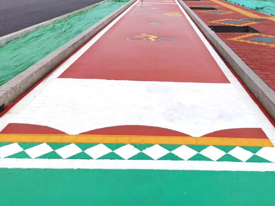 此次創(chuàng)新將SP彩色壓花、熒光瀝青路面工藝在慢車(chē)道上進(jìn)行試驗(yàn),施工時(shí)選用紅、綠、藍(lán)三種基礎(chǔ)顏色分段進(jìn)行。通過(guò)噴涂SP專(zhuān)用涂料,改變?yōu)r青面層顏色,不但提高了道路辨識(shí)度,同時(shí)能夠在無(wú)分隔帶道路中明確機(jī)非車(chē)道界限,有利于規(guī)范非機(jī)動(dòng)車(chē)規(guī)范行車(chē),降低事故發(fā)生概率。