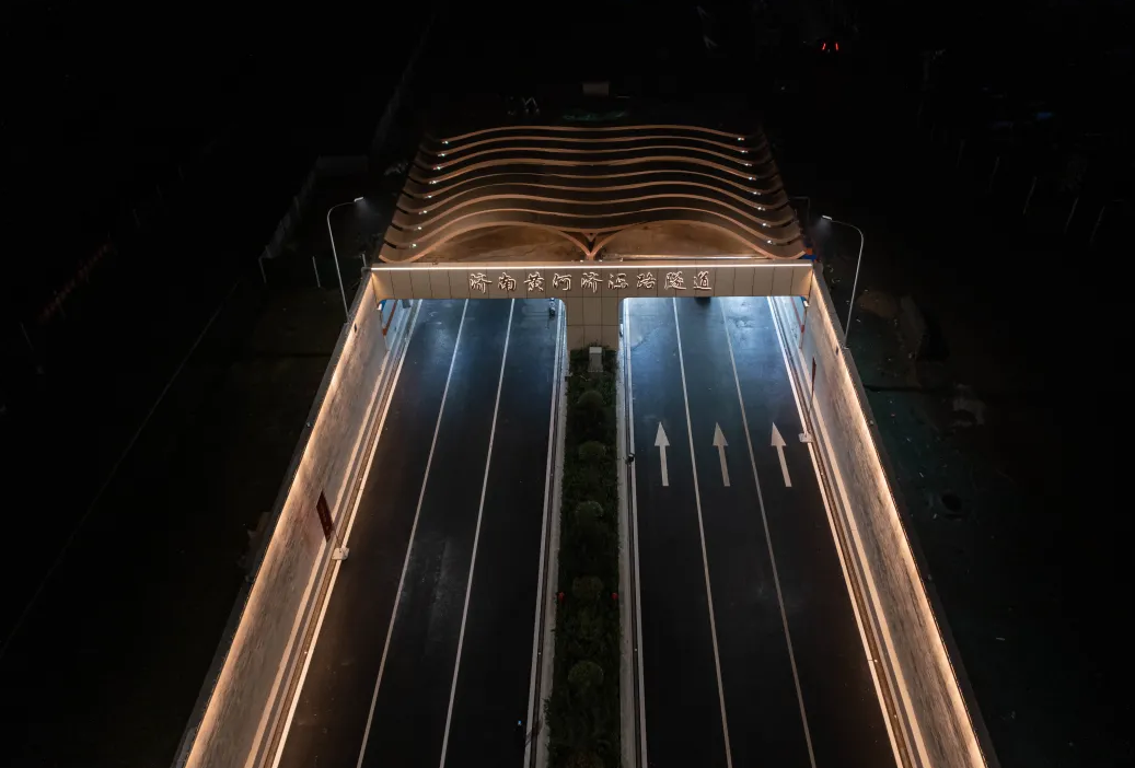 保持隧道主體工程結(jié)構(gòu)不變,通過增加裝飾,實(shí)現(xiàn)整體設(shè)計(jì)提升。隧道南北出口聲屏障以“歲歲九曲彎”和“歲歲安瀾”為設(shè)計(jì)主題,以中國(guó)傳統(tǒng)裝飾紋樣呈現(xiàn),夜晚還將呈現(xiàn)“日出黃河”的燈光效果。添加“流動(dòng)”與“水紋”的造型體現(xiàn)了黃河穿越之美,在隧道內(nèi)采用3D打印貼膜工藝?yán)L制白楊樹(寓意堅(jiān)韌、表達(dá)力求上進(jìn)的精神),以緩解駕駛員視覺疲勞。同時(shí)以黃河星空為題,中間段頂部弧線的燈光表現(xiàn)黃河穿越之感,暖色照明設(shè)計(jì)表現(xiàn),感受黃河星空光線流動(dòng)之美。