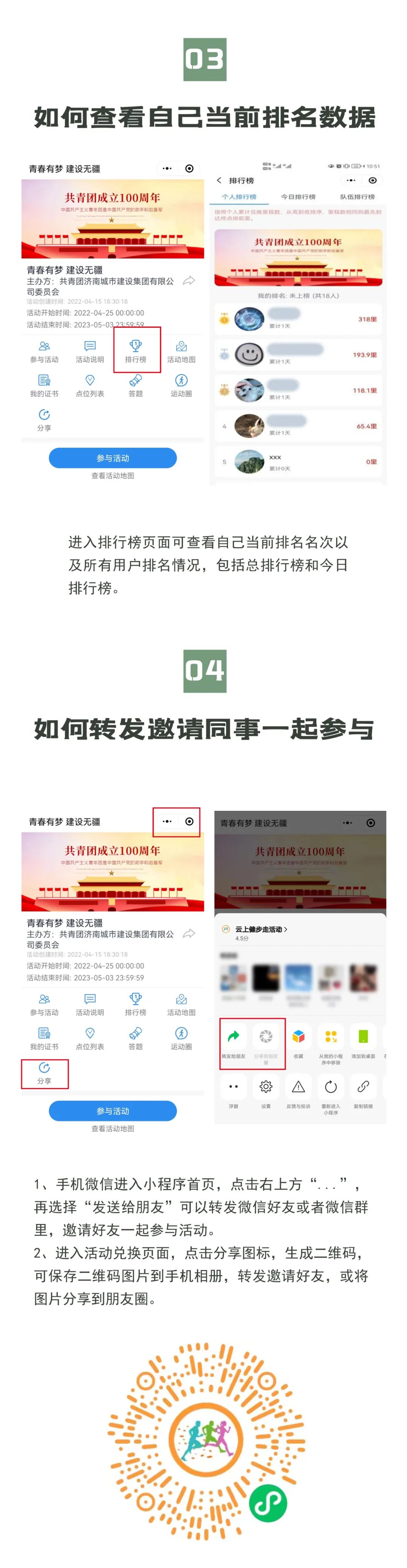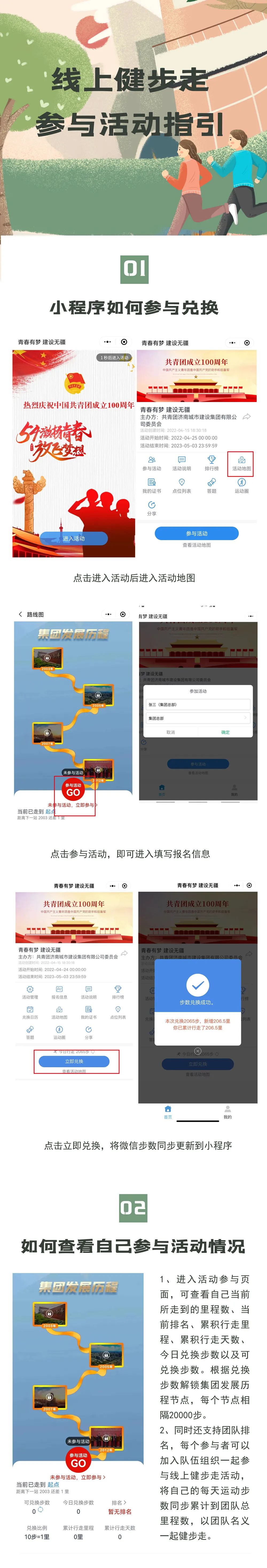 為慶祝建團(tuán)100周年,開展好“百年崢嶸、初心不改、青春與共、砥礪前行”主題教育實踐活動,展現(xiàn)集團(tuán)自成立以來的光輝歷程,賡續(xù)集團(tuán)紅色精神、凝聚集團(tuán)奮進(jìn)力量,不斷增強(qiáng)廣大職工的身體素質(zhì)和健康水平,不斷提高集團(tuán)的凝聚力和向心力。由共青團(tuán)濟(jì)南城市建設(shè)集團(tuán)有限公司委員會主辦,共青團(tuán)濟(jì)南金曰公路工程有限公司委員會、濟(jì)南新城文化傳媒有限公司承辦的“青春有夢 建設(shè)無疆”——職工線上健步走活動將于今晚零點正式上線,活動時間為2022年4月25日——5月3日(共十天)。