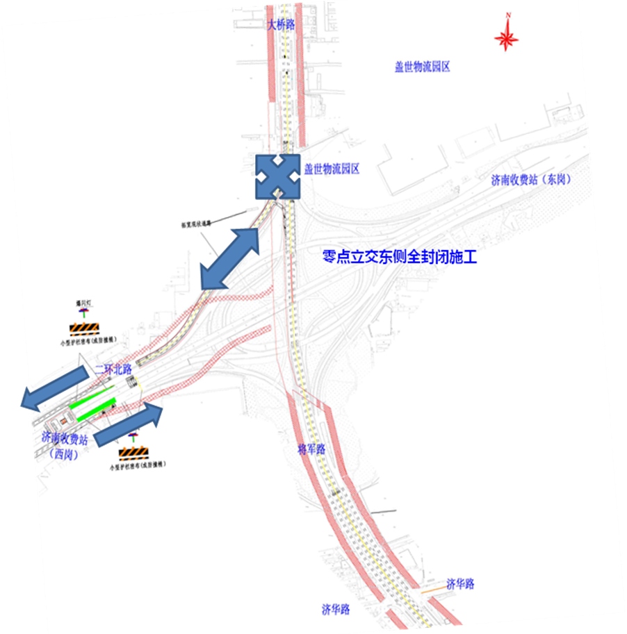 在此期間,零點立交橋下的大橋路南北向及G35濟廣高速主線東西向車輛正常通行。二環(huán)北路由西向東前往零點立交以北的左轉車輛,需通過零點立交橋西北象限擴建現狀道路與大橋路交叉口(現狀燈控口)進行交通轉換。其它車輛均需通過外圍相關道路繞行。