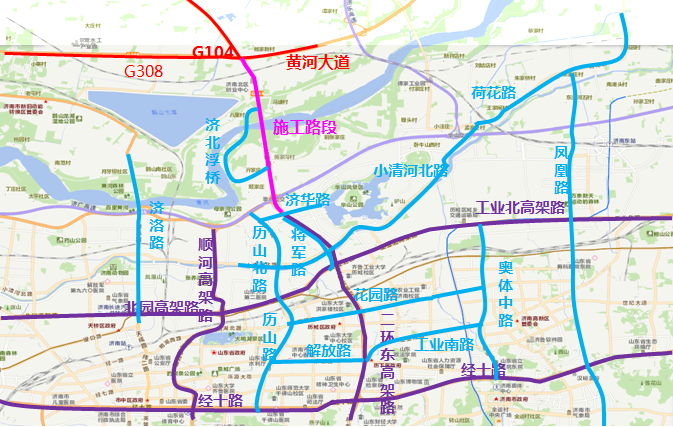 市區(qū)過路車輛可通過各城市快速路、干線道路繞行,經濟濼路隧道、濟南黃河鳳凰大橋、濟南建邦黃河大橋等道路向北跨越黃河。