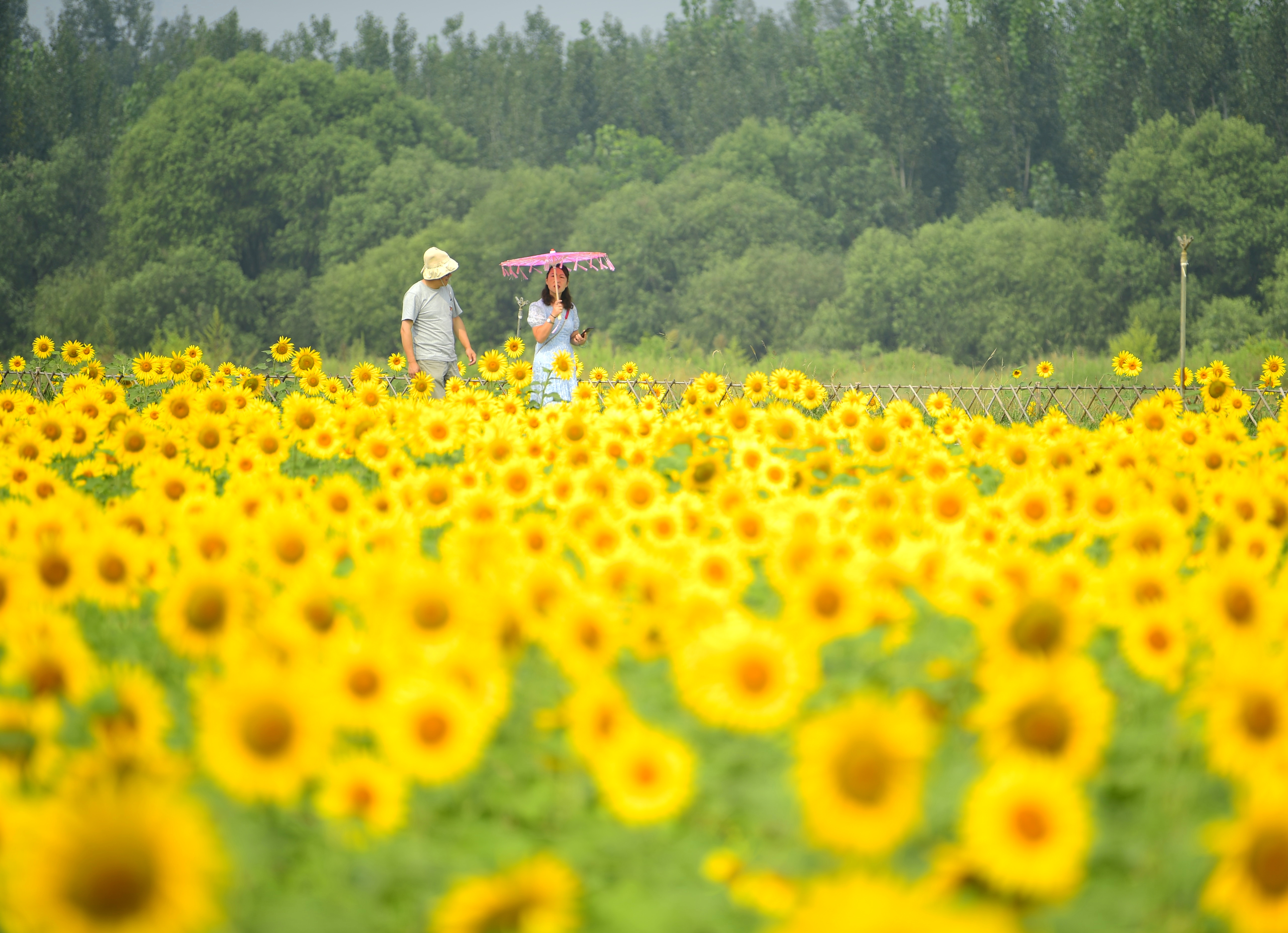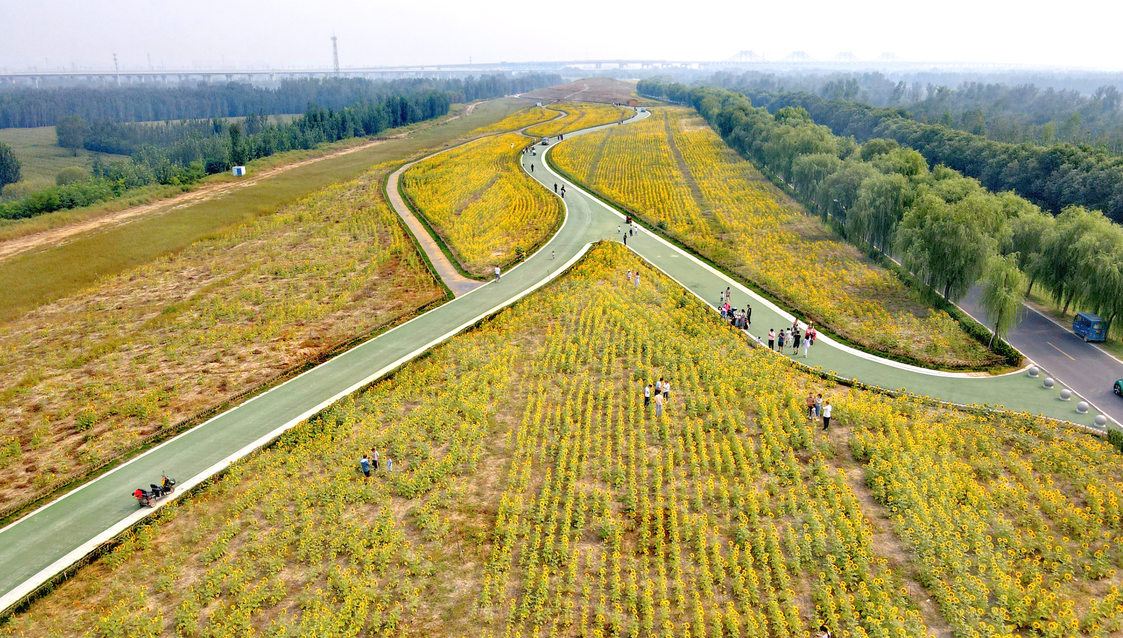 起步區(qū)黃河生態(tài)景觀風(fēng)貌帶示范區(qū)的鵲華秋色園內(nèi),上萬平米的葵花競相開放,橙黃的花蕊,金黃的花瓣,碩大的花盤,在翠綠枝葉的映襯下顯得分外明麗動人。不少市民慕名前來,漫步花海、游玩“打卡”。
