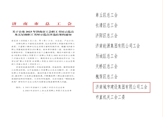 12月18日,濟南市總工會發(fā)布《關于公布2023年濟南市工會職工書屋示范點及五星級職工書屋示范點評選結果的通知》,濟南城市建設集團有限公司職工書屋獲評2023年濟南市工會職工書屋示范點。