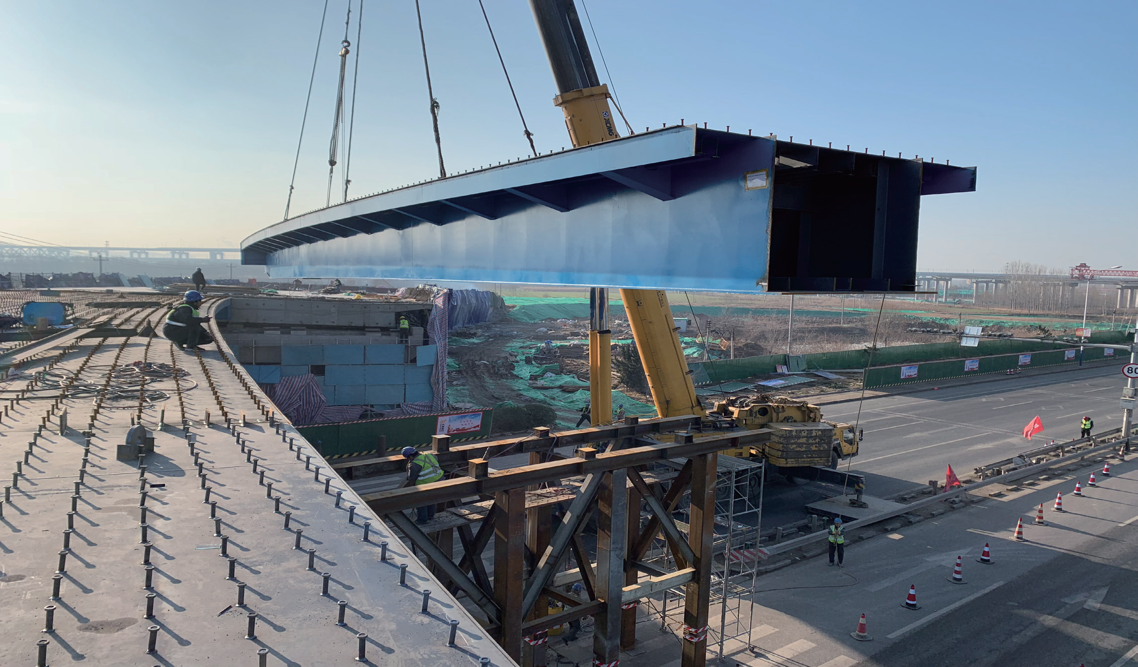 該項(xiàng)目“三跨青銀,兩跨濟(jì)青”,工程起點(diǎn)3次跨越青銀高速,工程終點(diǎn)2次跨越濟(jì)青高速,所有跨越都在不中斷交通的情況下進(jìn)行的。在施工過(guò)程中,把重達(dá)140噸的箱梁整體跨越,對(duì)工藝、技術(shù)、安全等都有極高的要求。項(xiàng)目部先后組織召開四次專家論證會(huì),對(duì)多個(gè)方案進(jìn)行比選,形成最優(yōu)方案,提前24天完成G220鋼箱梁吊裝施工,未出現(xiàn)任何安全問(wèn)題。在鋼橋橋面施工中采用了澆筑式瀝青混凝土鋪裝,有效延長(zhǎng)了橋梁主體和路面的使用壽命,降低了養(yǎng)護(hù)、維修和管理費(fèi)用。道路伸縮縫口設(shè)計(jì)成S波浪型,有效吸收車輛輪胎的沖擊動(dòng)能,降低噪聲,提高行車舒適度。