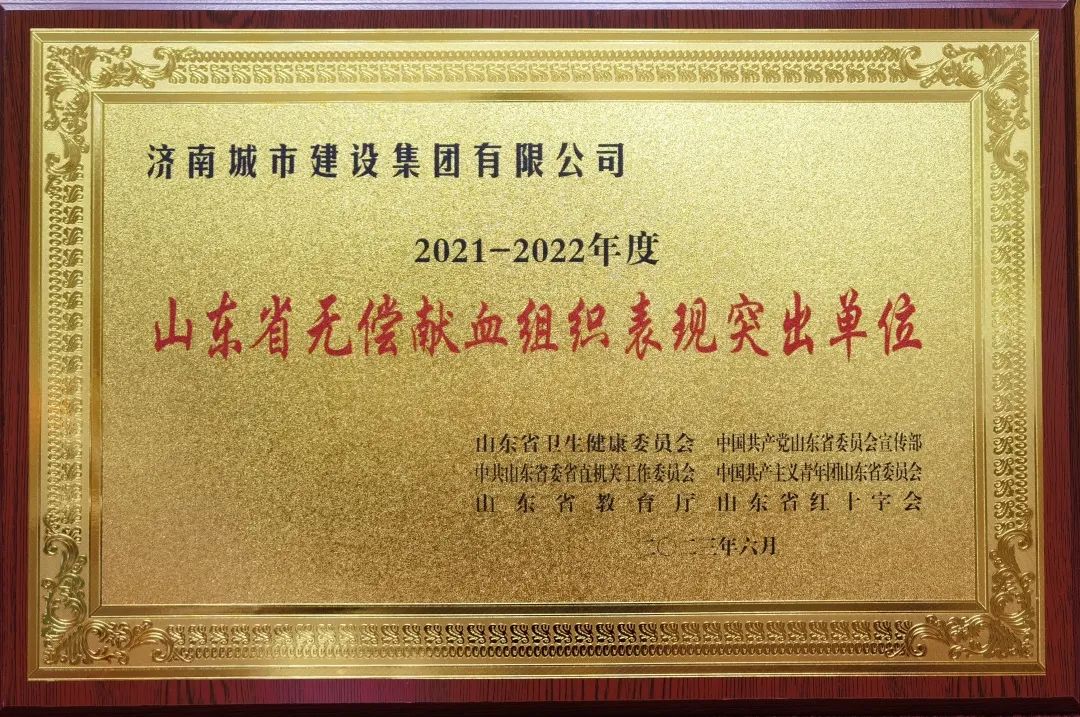 6月14日,值第二十個“世界獻(xiàn)血者日”,山東省衛(wèi)生健康委在濟(jì)南舉行山東省2023年世界獻(xiàn)血者日宣傳活動,對榮獲全國無償獻(xiàn)血表彰和全省無償獻(xiàn)血表揚(yáng)的集體和個人頒發(fā)獎牌和證書,濟(jì)南城市建設(shè)集團(tuán)榮獲“山東省無償獻(xiàn)血組織表現(xiàn)突出單位”榮譽(yù)稱號。