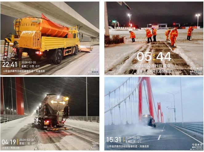 濟南金曰公路工程有限公司承建的國道309、濟南黃河公路大橋、國博城等項目立即啟動應急預案,開啟“機械+人工”的聯(lián)動除雪模式,對交叉路口、車輛密集、人員密集等區(qū)域進行重點清理,雪中除雪效果顯著。截至目前,共計出動應急隊伍150余人,調(diào)配自有和所在轄區(qū)街道辦除雪機械設備30余臺(套),撒布融雪劑30余噸。全力保障了重要干線道路通暢,確保了周圍居民的安全通行。