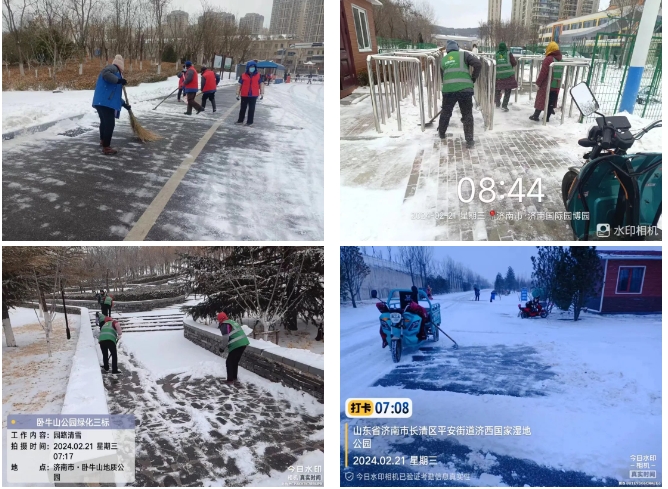 濟南城市建設集團園區(qū)管理有限公司提前做出預判并發(fā)布相應通知,為惡劣天氣應急管理做好全面準備。華山、濟西濕地、濟南園博園三大景區(qū)及時響應、迅速行動,全力組織開展掃雪除冰工作,利用掃雪車、雪鍬、雪鏟等工具,對景區(qū)內(nèi)各出入口、廣場、道路臺階等重點部位進行清雪、清冰工作并鋪設相應防滑措施,保障道路暢通與市民游客安全,最大限度減少低溫雨雪天氣影響。