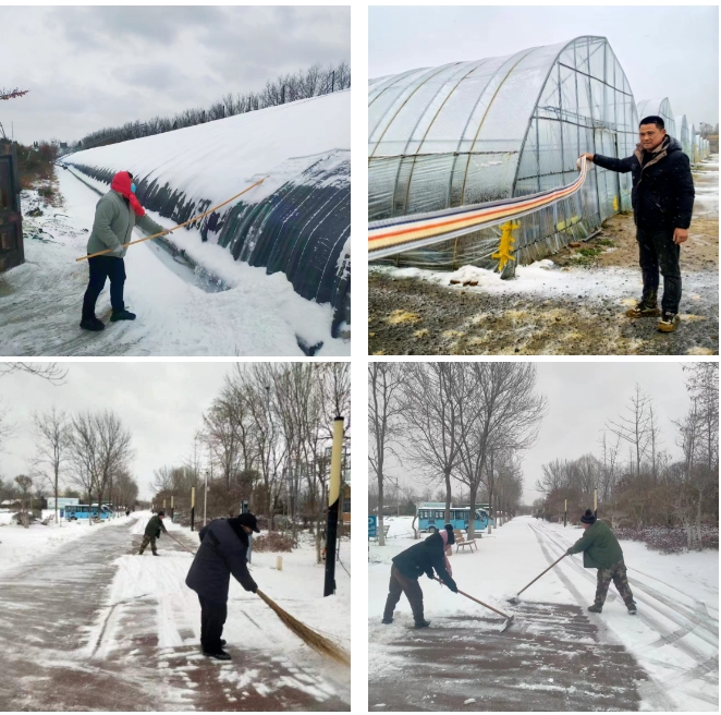 山東濟西濕地生態(tài)農(nóng)場有限公司提前組織人員檢修溫室大棚設施,保證正常運轉(zhuǎn),同時,加強棚內(nèi)保溫,指導租戶及時關閉放風口、防風保溫。加強值守和巡查,做到隨下隨清,尤其注意加強夜間除雪,避免積雪或冰層過厚壓塌棚室,及時清理園內(nèi)主次干道積雪,確保道路通暢。