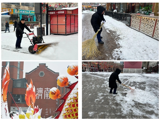 濟南泉世界商業(yè)管理有限公司召集物業(yè)團隊提前對印象濟南·泉世界進行緊急除雪應對部署。根據(jù)特殊天氣情況在商戶群內(nèi)提前下發(fā)溫馨提示,提醒商家大雪天氣地面濕滑、注意出行安全,同時做好相關保障措施。公司督導物業(yè)公司提前對除雪設施設備進行保養(yǎng),備好除雪物資。街區(qū)從凌晨開始對商戶門前、主干道及街區(qū)內(nèi)外部道路進行清掃工作,借助掃雪機對主干道進行大清工作,為商戶及游客開辟出暢通安全的道路。