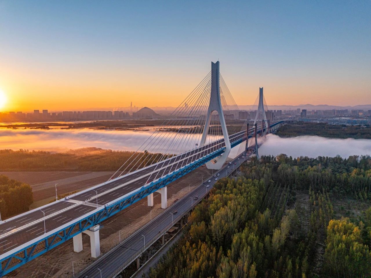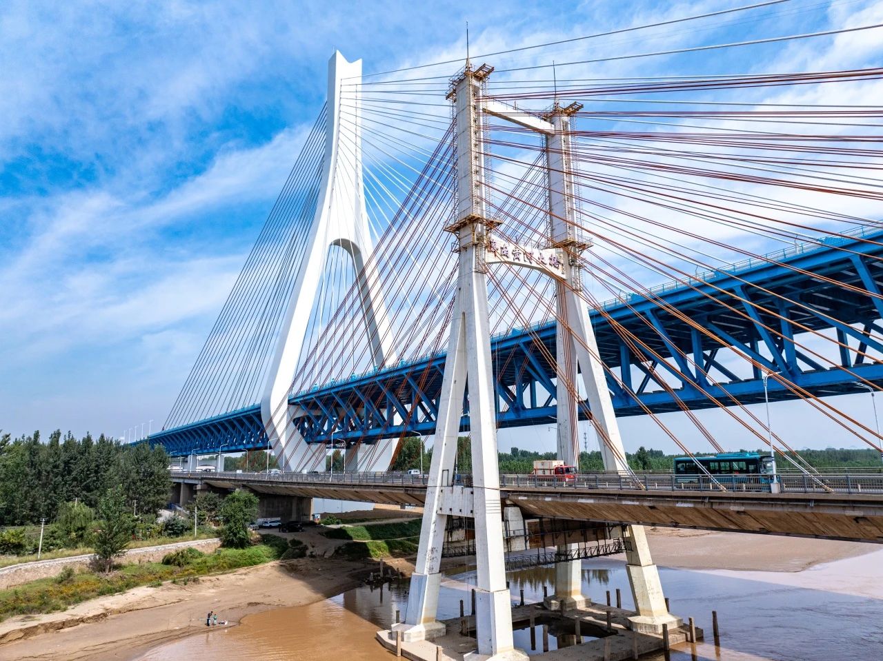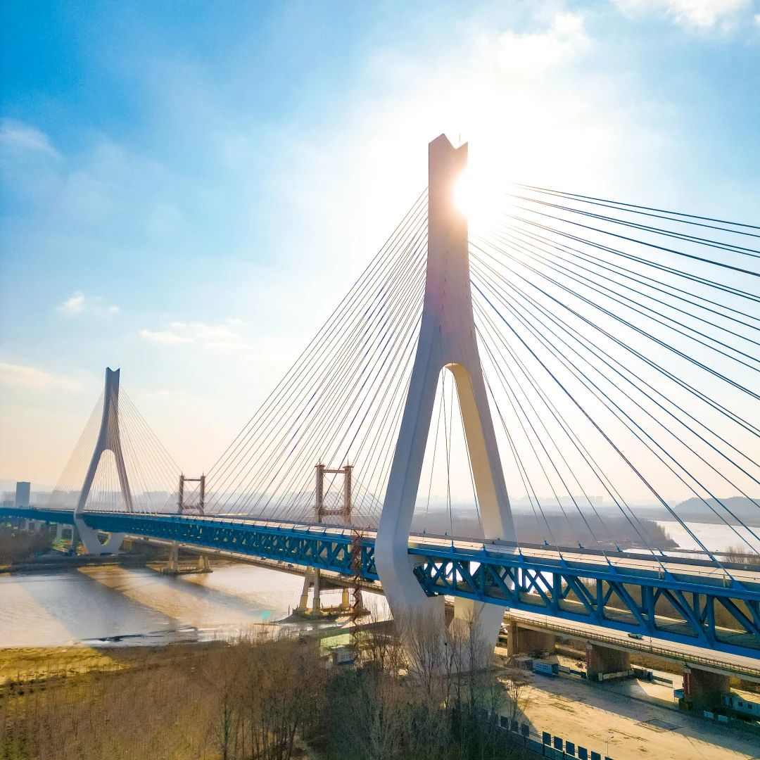 1982年7月,濟南黃河大橋(老橋)建成通車,作為當時亞洲跨徑最大的公路斜拉橋,入選濟南“1978—1988泉城十大景觀”。如今,新橋與老橋“并肩”相望,成為黃河上第一座不等跨并橋建設工程,也是黃河上跨徑最大、鋼橋總長最長的公軌分層合建橋梁,刷新“跨黃”橋梁紀錄。