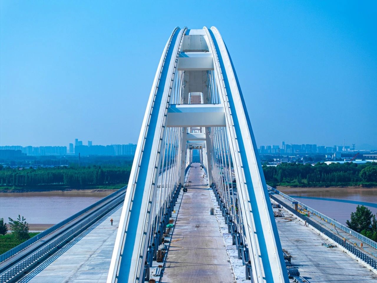 齊魯黃河大橋主橋為“公軌同層,軌道居中”,雙向八車道一級公路標準,主橋鋼箱梁寬60.7米,是世界最大跨度、最寬鋼箱梁、最高應力幅拉索的下承式組合梁網(wǎng)狀系桿拱橋。同時,濟南黃河齊魯大橋跨黃河特大橋?qū)⒐?、軌道交通、人行道和非機動車道同層共建,實現(xiàn)了橋位資源和土地的集約化利用,減少了對河道和環(huán)境的干擾,降低了工程成本。