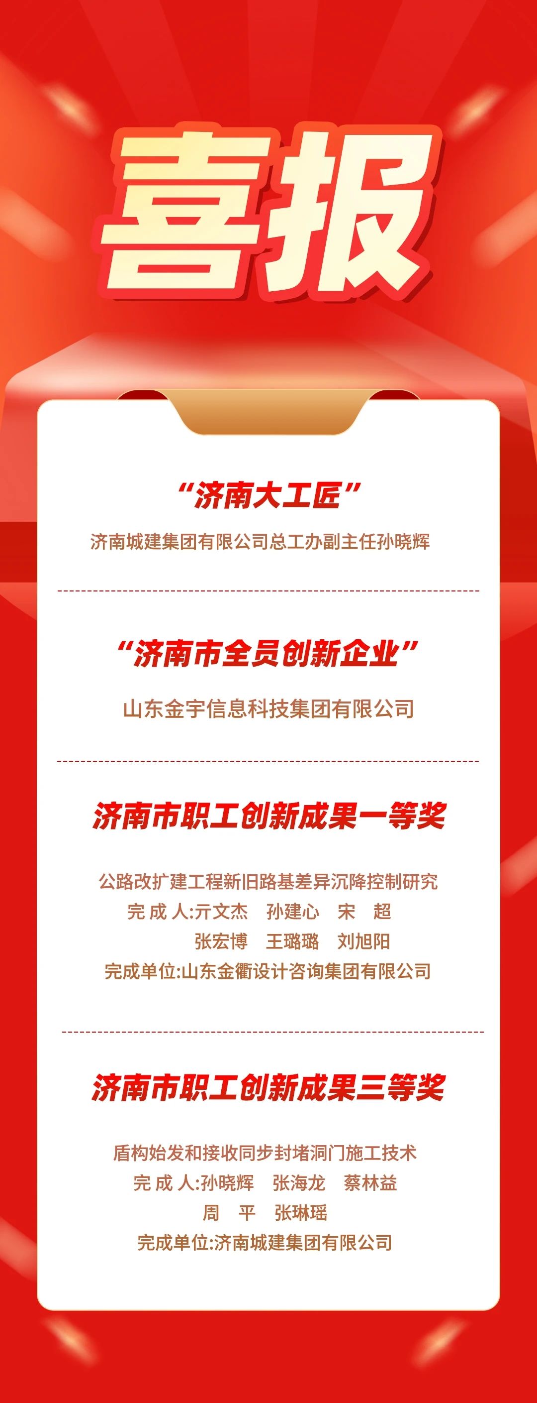 近日,濟南市總工會發(fā)布《關于公布2024年度 “濟南工匠”的通知》《關于公布2024年度泉城職工全員創(chuàng)新競賽結果的通知》,建設集團多個集體及個人獲表彰。