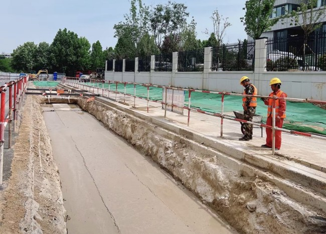 在濟南高新區(qū)章錦片區(qū)路網(wǎng)完善工程總承包項目創(chuàng)新應(yīng)用新型材料流態(tài)固化土,利用工程棄土摻入一定量的專用固化劑加水拌合均勻后形成可泵送、自流平、自密實且凝固后能達到一定強度的新型建筑材料,具有施工速度快、耐久性強,收縮性小、滲透性低,物盡其用、變廢為寶等優(yōu)勢。