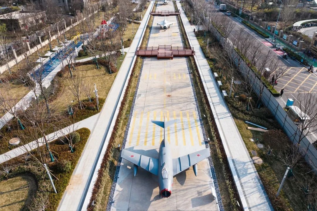 公園南區(qū)入口打造文化長廊,通過展示中國戰(zhàn)機(jī)發(fā)展史讓市民了解空軍文化;結(jié)合原有170米長水泥跑道,通過景觀手法進(jìn)行二次設(shè)計,融合機(jī)場跑道符號、導(dǎo)航等設(shè)施還原機(jī)場跑道場景,沿跑道科普展示曾在張莊機(jī)場服役的戰(zhàn)機(jī)模型,進(jìn)行航空科普、國防軍事及愛國主義教育。