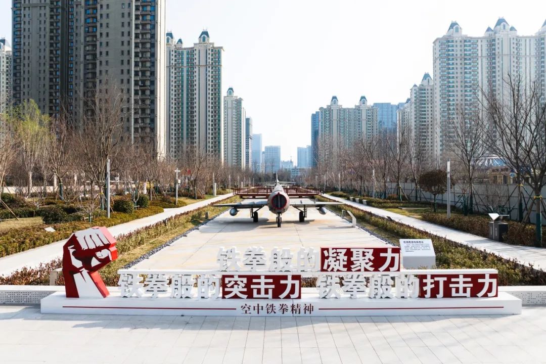 在公園南地塊紀(jì)念廣場,通過展示張莊機(jī)場原駐扎部隊6位空軍戰(zhàn)斗英雄的雕像和英雄事跡,以及“空中鐵拳精神”展示,傳承紅色基因。