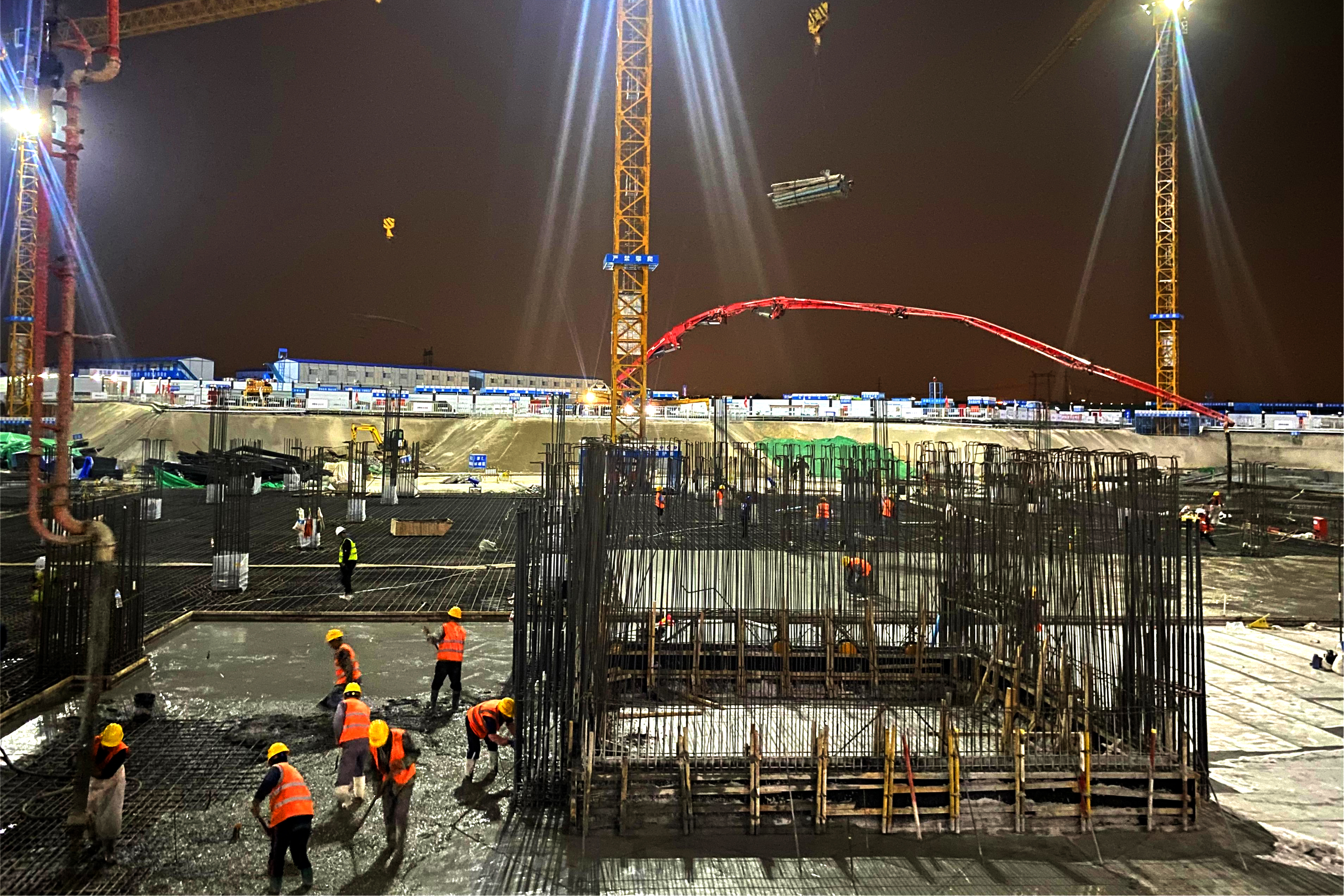 本次筏板混凝土施工使用2臺84米汽車泵進(jìn)行澆筑,歷時30小時,共計澆筑混凝土1752立方。施工澆筑跨度大、項目標(biāo)準(zhǔn)高,項目部提前策劃,精準(zhǔn)分析施工重點難點,明確質(zhì)量及安全保證措施,做好各項突發(fā)事件的應(yīng)急預(yù)案。對防水施工、模板標(biāo)高、鋼筋保護(hù)層厚度等關(guān)鍵環(huán)節(jié)進(jìn)行細(xì)致的檢查和驗收,嚴(yán)格按照施工規(guī)范進(jìn)行操作,確保澆筑的順利完成。