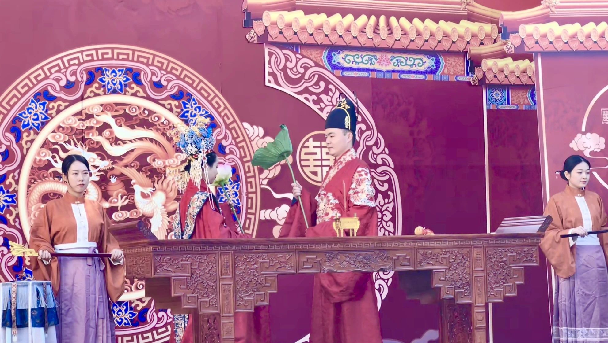 “山河月明”羅芙威宮中式婚禮展演,盛世華禮、古韻十足,演員們身著華彩衣裝,恍若穿越千古時光翩翩而來,在印象濟(jì)南·泉世界東門主街,帶領(lǐng)市民游客沉浸式體驗(yàn)中式婚禮的浪漫。