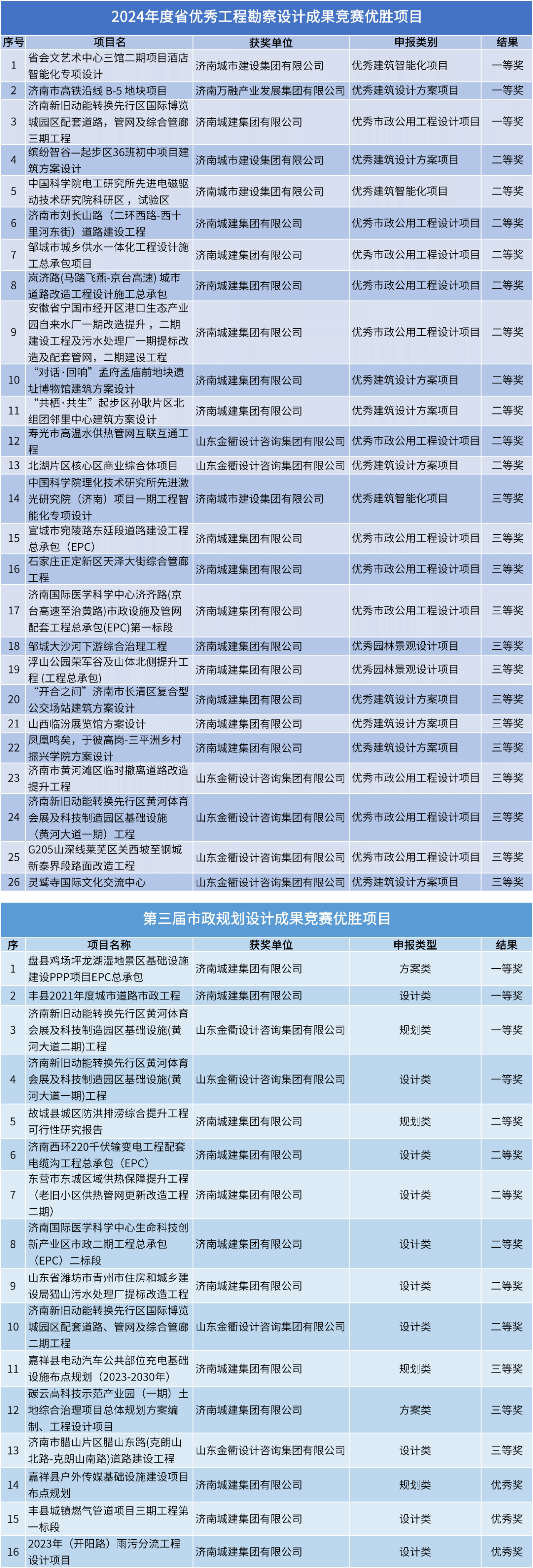 近日,建設集團及其所屬濟南萬融產業(yè)發(fā)展集團有限公司、濟南城建集團有限公司、山東金衢設計咨詢集團有限公司在2024年度優(yōu)秀工程勘察設計成果競賽和第三屆市政規(guī)劃設計成果競賽兩項省級賽事中斬獲佳績。