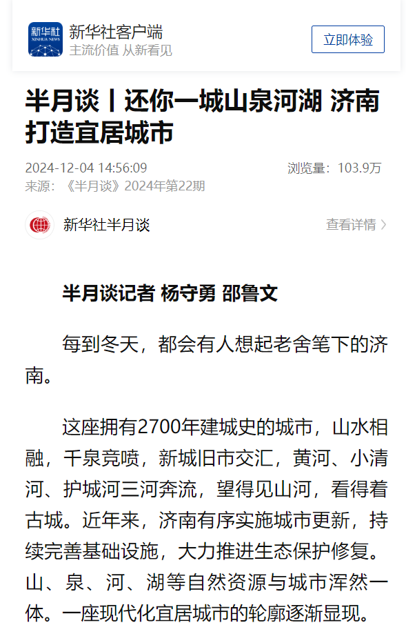 這座擁有2700年建城史的城市,山水相融,千泉競噴,新城舊市交匯,黃河、小清河、護城河三河奔流,望得見山河,看得著古城。近年來,濟南有序?qū)嵤┏鞘懈?,持續(xù)完善基礎(chǔ)設(shè)施,大力推進生態(tài)保護修復(fù)。山、泉、河、湖等自然資源與城市渾然一體。一座現(xiàn)代化宜居城市的輪廓逐漸顯現(xiàn)。