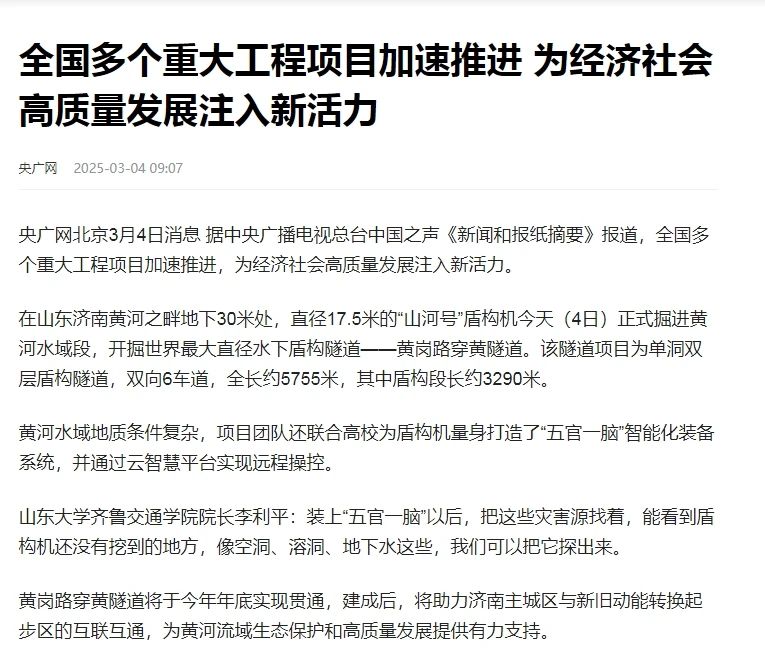 濟(jì)南廣電·叮咚FM客戶端3月4日訊 當(dāng)前,濟(jì)南各重點(diǎn)項(xiàng)目搶抓春季施工“黃金季”,掀起如火如荼的施工熱潮。3月4日,中央廣播電視總臺(tái)中國(guó)之聲《新聞和報(bào)紙摘要》欄目聚焦各地重點(diǎn)工程建設(shè)加緊推進(jìn),為經(jīng)濟(jì)發(fā)展注入新動(dòng)能,播發(fā)了由濟(jì)南新聞綜合廣播記者協(xié)助完成的新聞,重點(diǎn)報(bào)道濟(jì)南黃崗路穿黃隧道項(xiàng)目建設(shè)進(jìn)展和工程亮點(diǎn)。