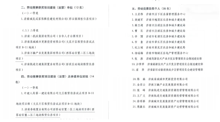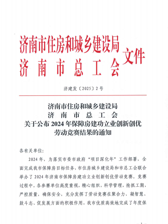 近日,濟南市住建局、市總工會公布2024年保障房建功立業(yè)創(chuàng)新創(chuàng)優(yōu)勞動競賽結果的通知,建設集團所屬濟南萬融產(chǎn)業(yè)發(fā)展集團有限公司榮獲項目建設(運營)單位二等獎、公司職工金宗云獲評先進個人,萬融集團所屬濟南春曉置業(yè)有限公司西客站安置二區(qū)三地塊項目部榮獲項目建設(運營)及參建單位班組一等獎。